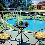 Sunny Cozy Apartment Primorsko设有水池景的露台. 室外游泳池和健身中心可供客人使用.